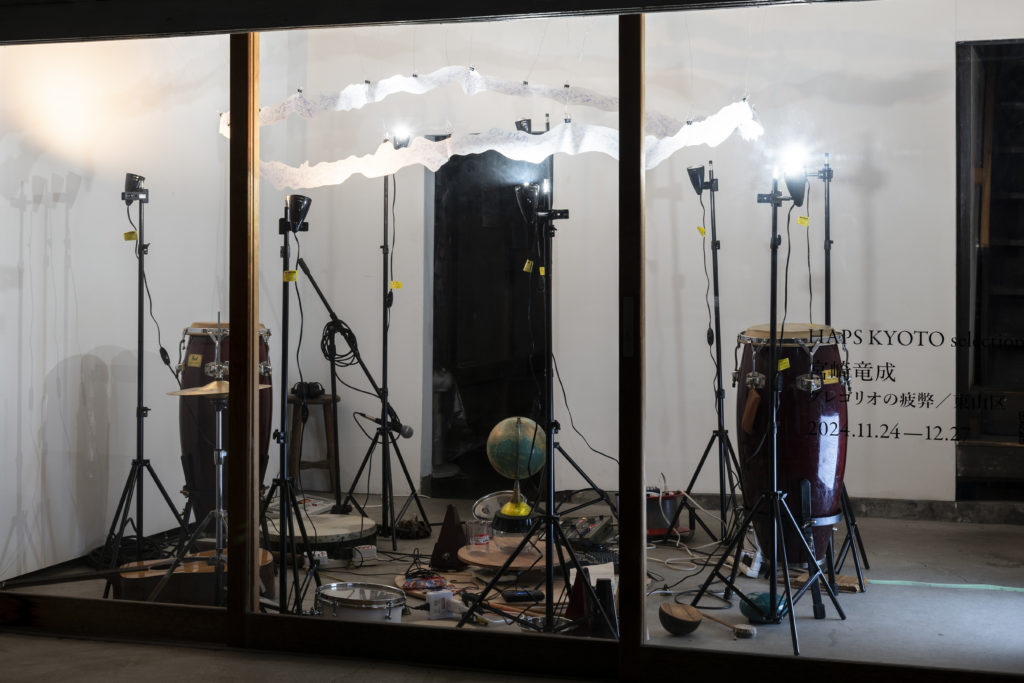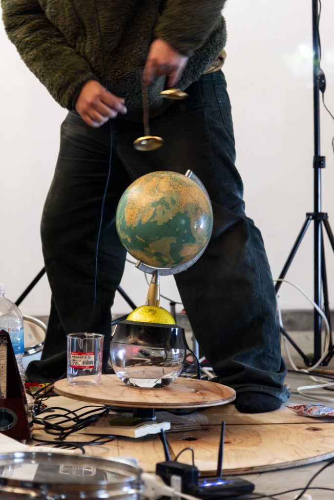 A 24-hour sound performance spanning from midnight to midnight. On stage, 24 round percussion instruments (which produce sound upon contact) are arranged in a circle. During the performance, the 24 instruments arranged in a circle are played clockwise for one hour each. Drawings depicting the history of calendars adorn the venue walls, serving as the performance score. This score is written in a mountain-like pattern aligned with the tidal chart (the height of the sea’s ebb and flow) for that day at the nearest coastline to the performance and exhibition space. During the performance, the musicians adjust the layering of sounds using a looper and apply dynamics according to this elevation difference.