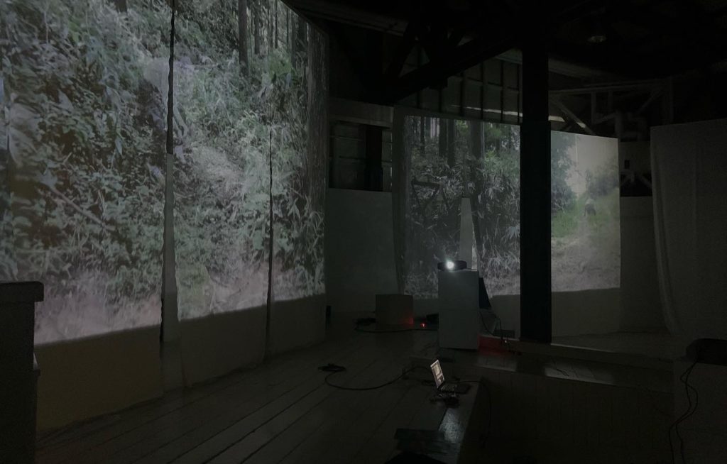 アート工房の空間を暗室にし、巨大な布を複数吊り下げ、金沢の舞踏家の松本拓也が泉鏡花の小説ある『高野聖』の登場人物や出来事について踊る映像を三面で映し出し、また、二組の朗読家による小説を元にしたテキストの音声が複数流され、さらに独特な重奏的情景を音響によって会場に表現した。