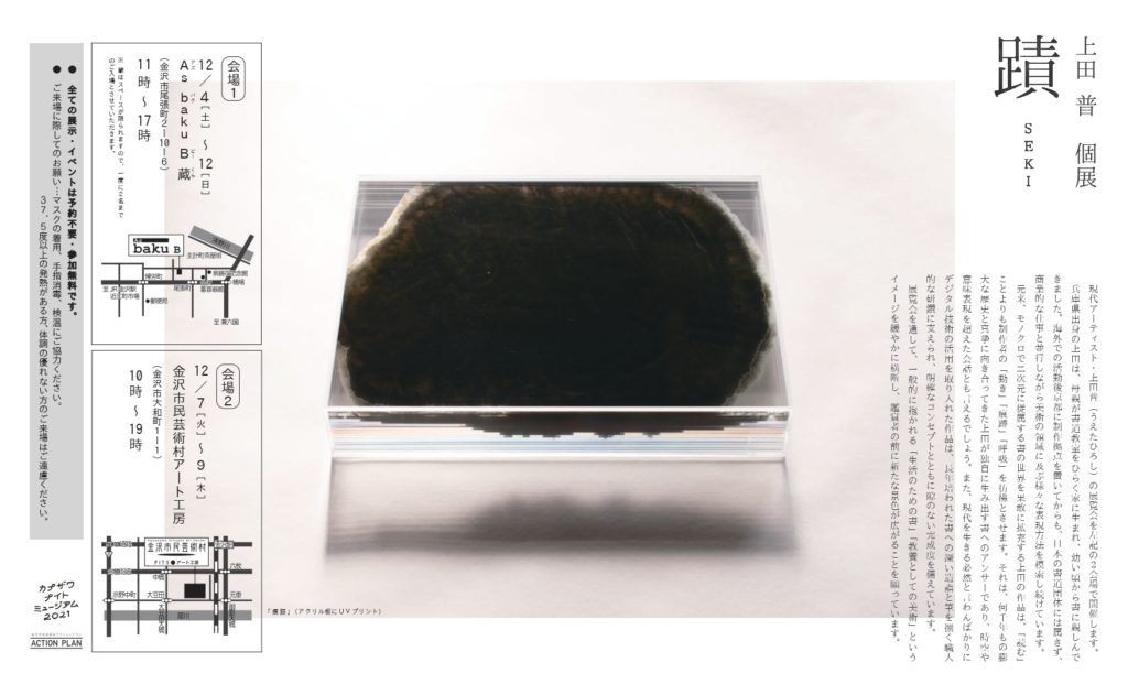本企画は金沢ナイトミュージアム2021のコーディネーターである金谷亜佑美氏が企画した書道家、上田普の展覧会を、金沢市民芸術村アート工房と共同で実施したものである。企画趣旨やキュレーションは金谷さんを中心に行い、私は金谷さんと共に展覧会の会場構成やパフォーマンス構成等のディレクションで関わった。