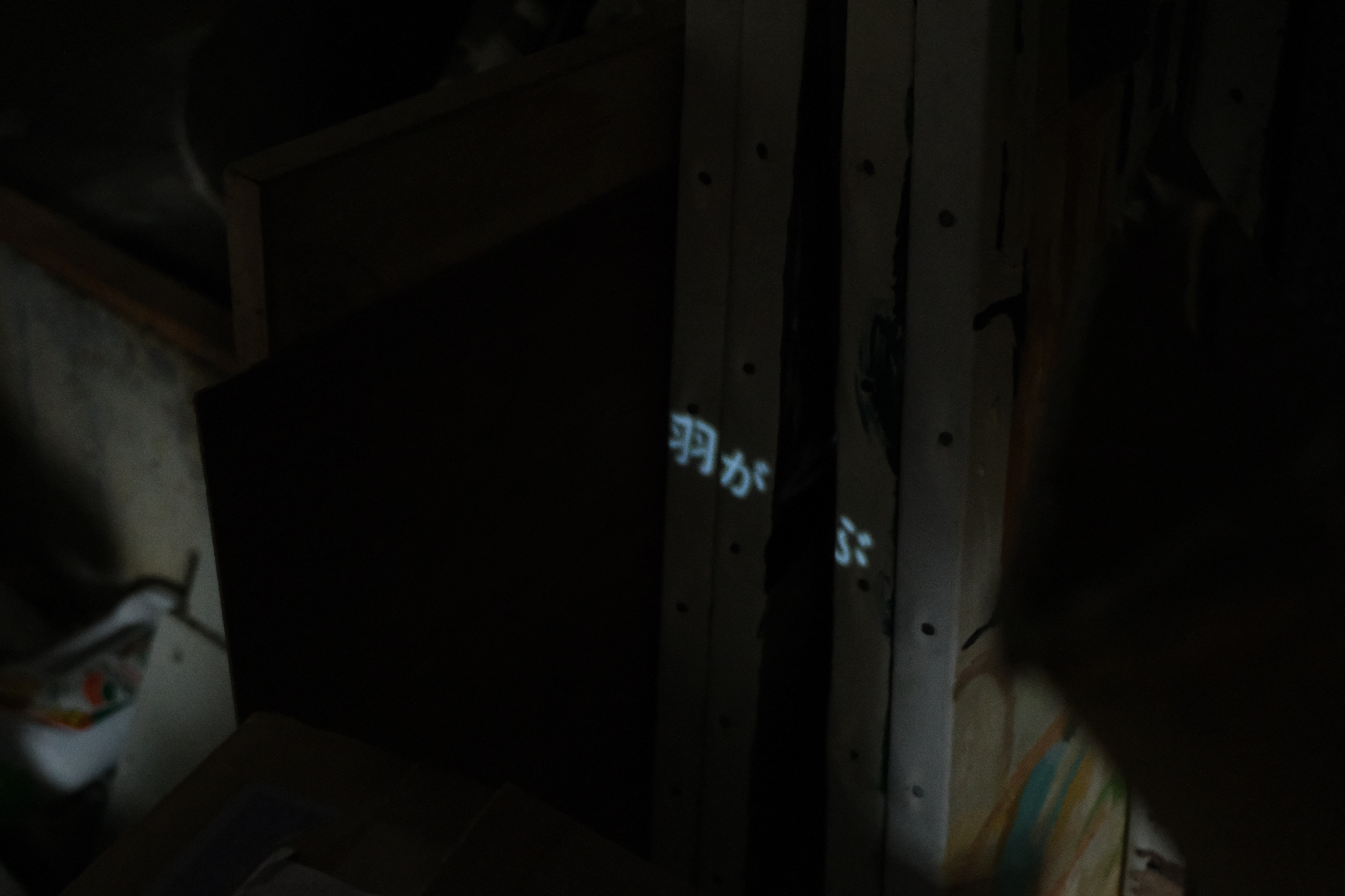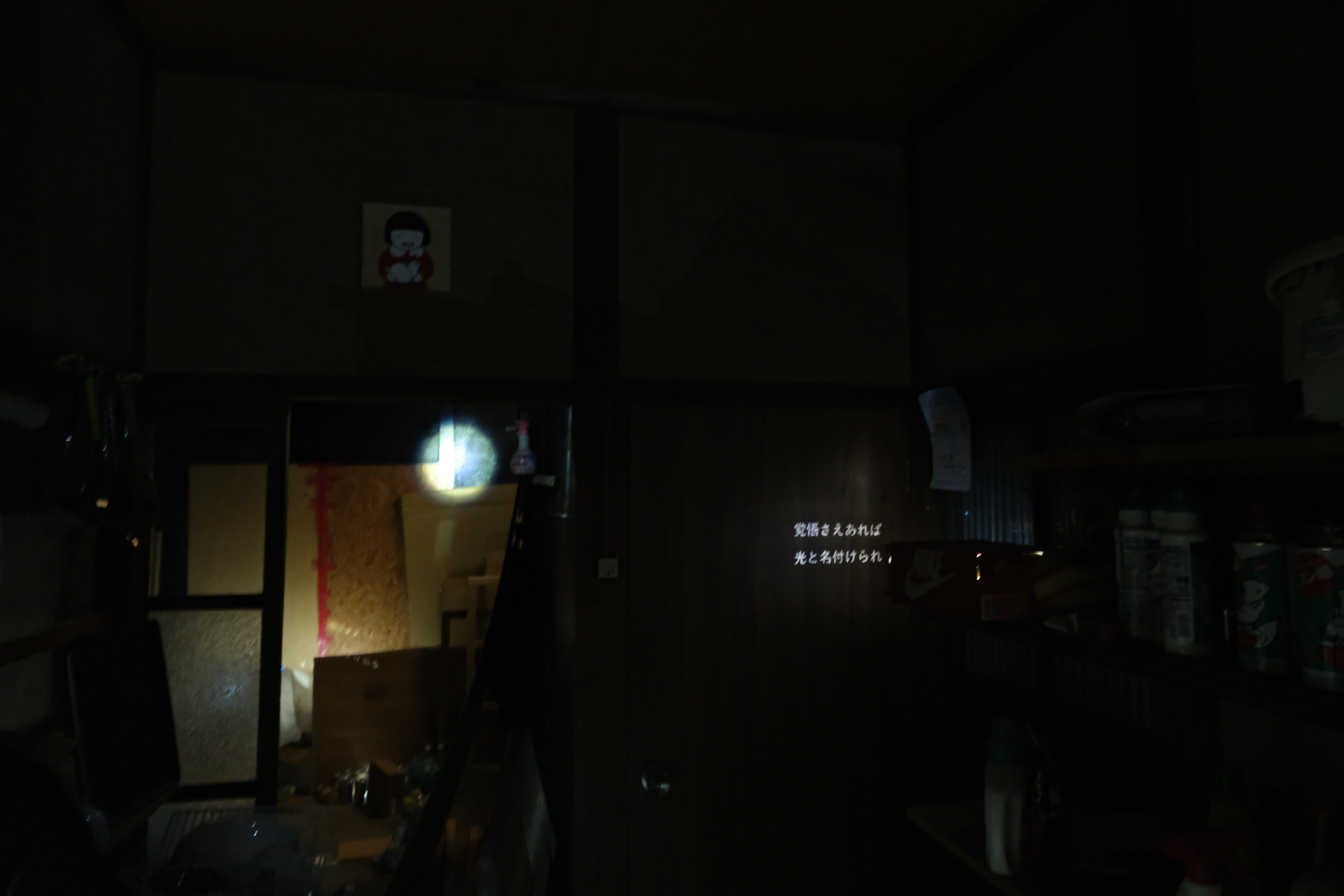光で照射されたテキストはそれ自体で物語を紡げるようなものではない、しかし極めてプライベートなシーンとして描かれる。そのプライベートさは一見閉じられた様相を帯びるようだが、その閉じられの主体は存在しない(あるいは巧みに隠蔽される)。故に文字が文字のまま宙吊りになるような感覚が喚起されるだろう。この光、テキスト、環境音、作られた環境音が、閉じられた密室を閉じられたまま、しかし他者が侵入し、互いに浸透し合い、異質な空間性を帯びるよう試みられている。