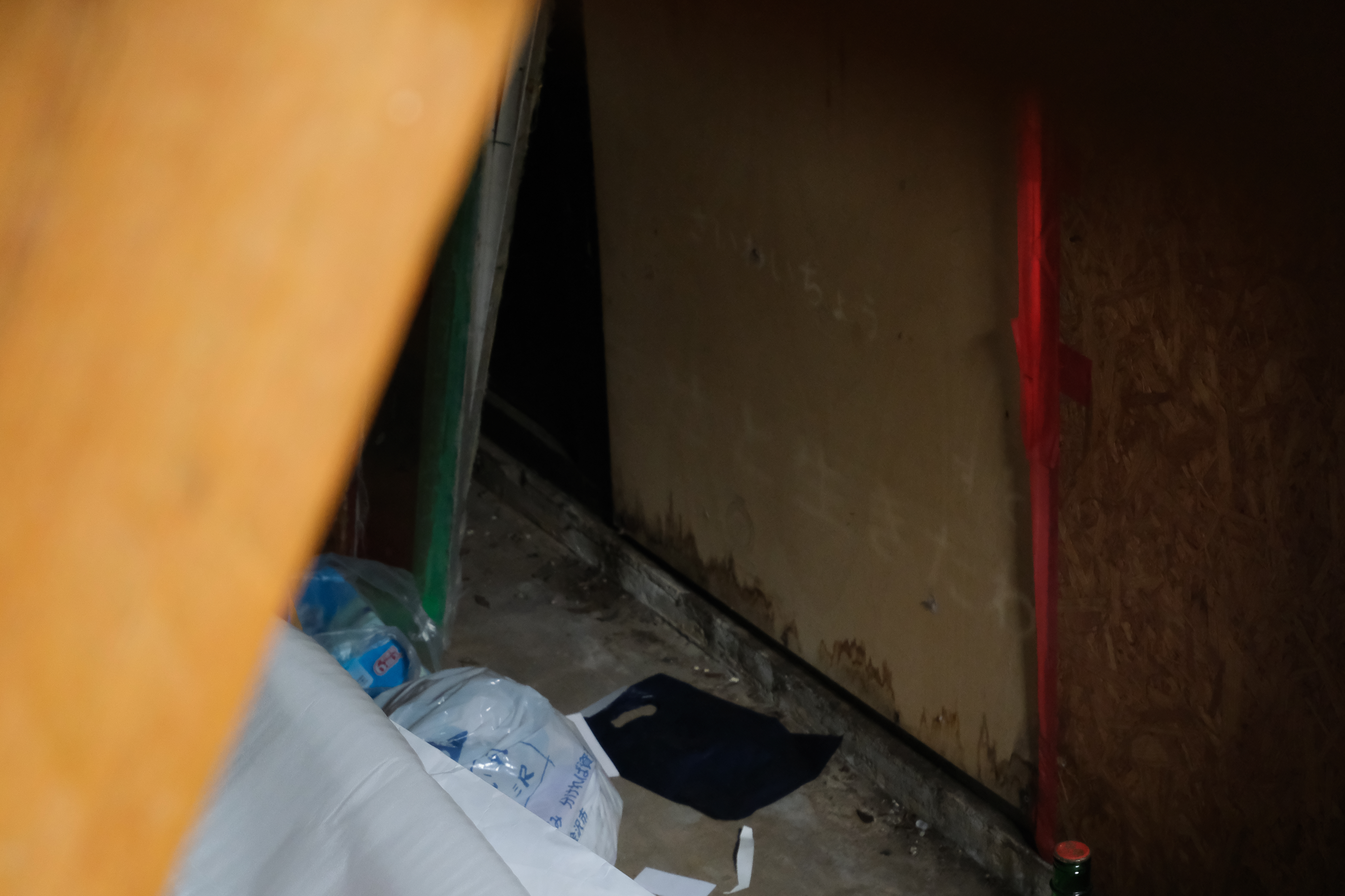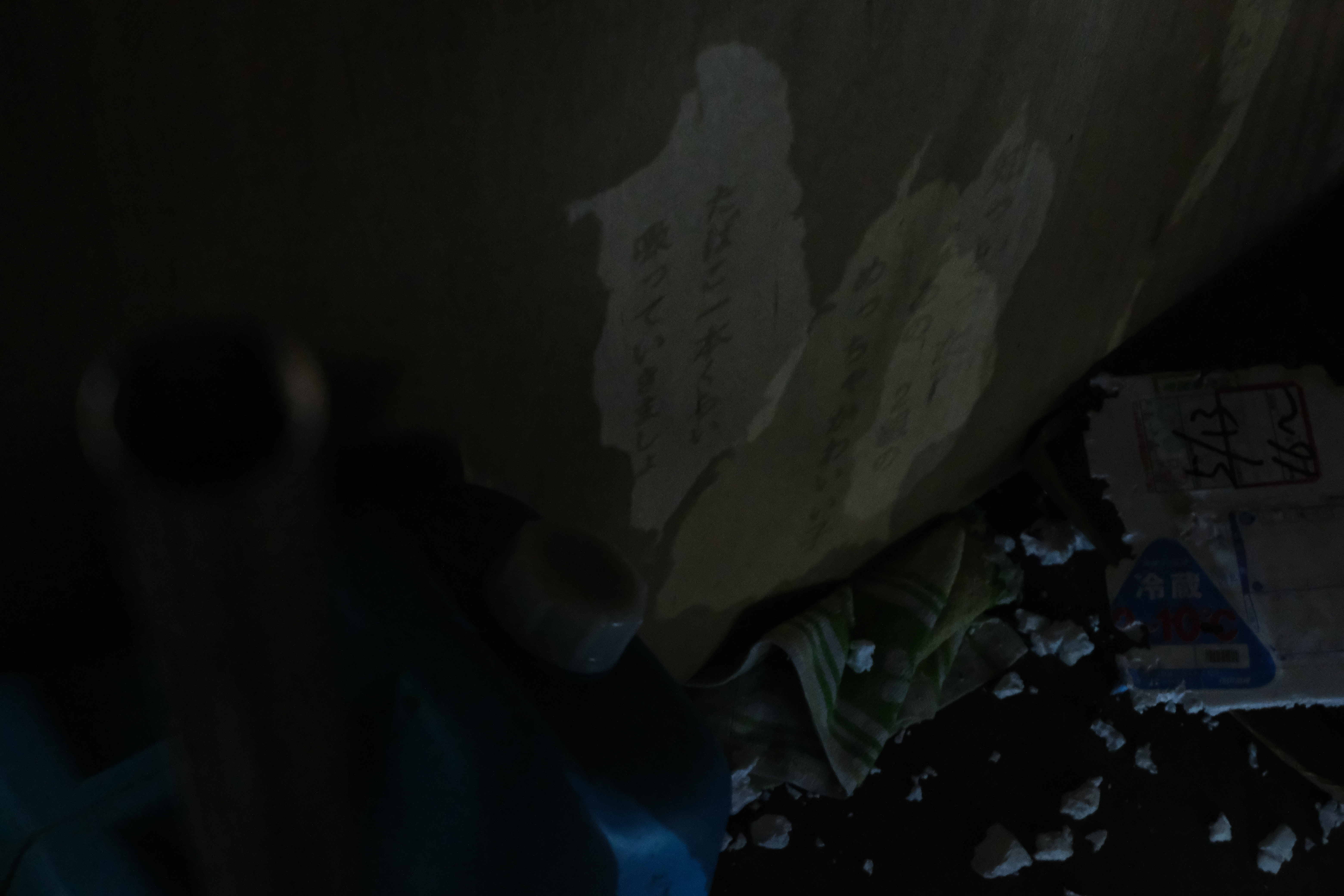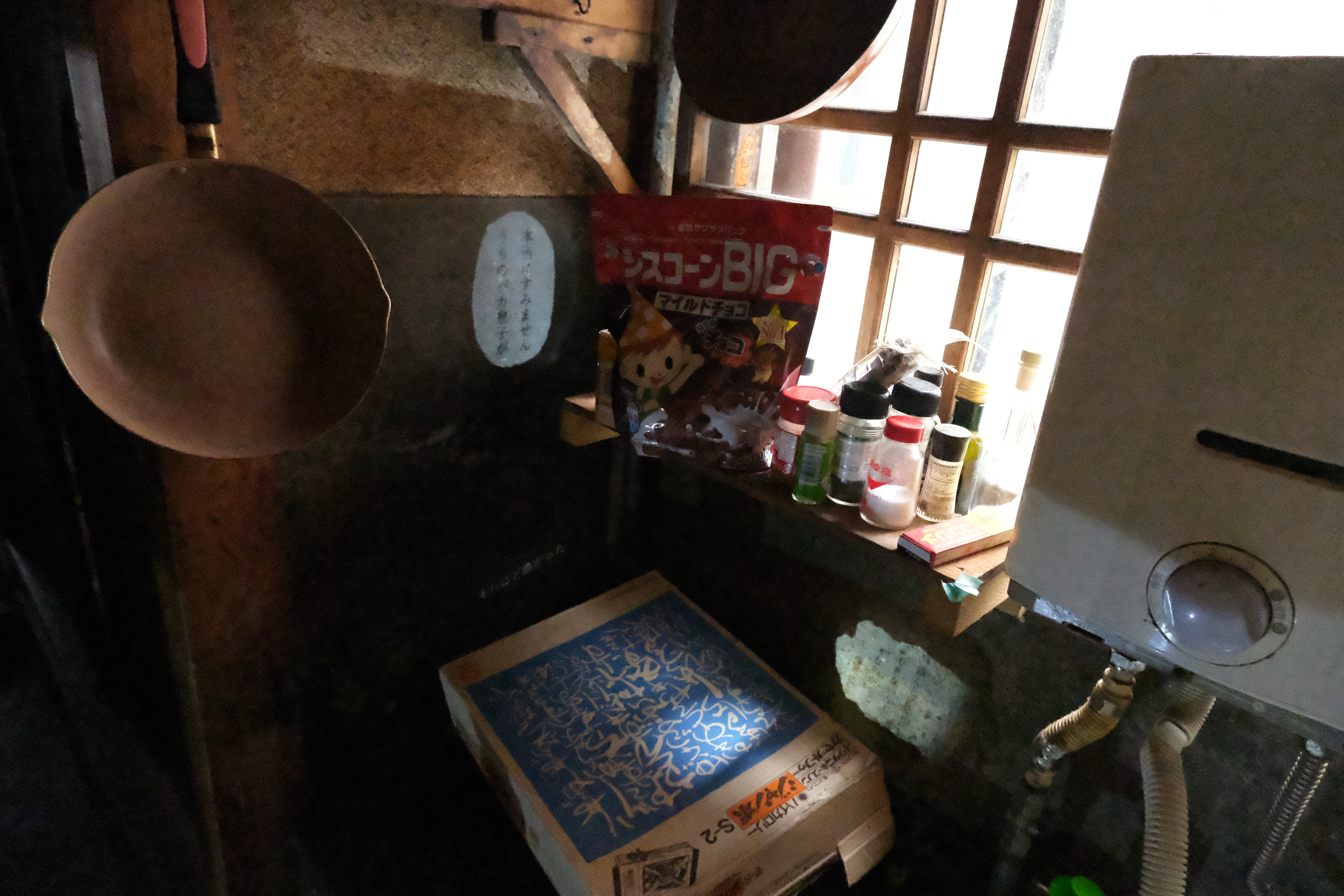 "Microcosmos in a "Semi-"Closed Room" is an installation in which Aiko Tsutsui's text is illuminated by light in the home of Ryusei Miyazaki. Tsutsui's text is displayed on the first floor of the exhibition space, and in the room on the second floor, which is off-limits to the public, Miyazaki's collage of environmental sounds from the area around his house is played at a low volume. This collage of environmental sounds intersects with the actual environmental sounds outside the venue. This is intended to link the sensation that the viewer is entering the closed space of the artist's home with the sensation that everyday life is continuing in the space and the actual environmental sounds.