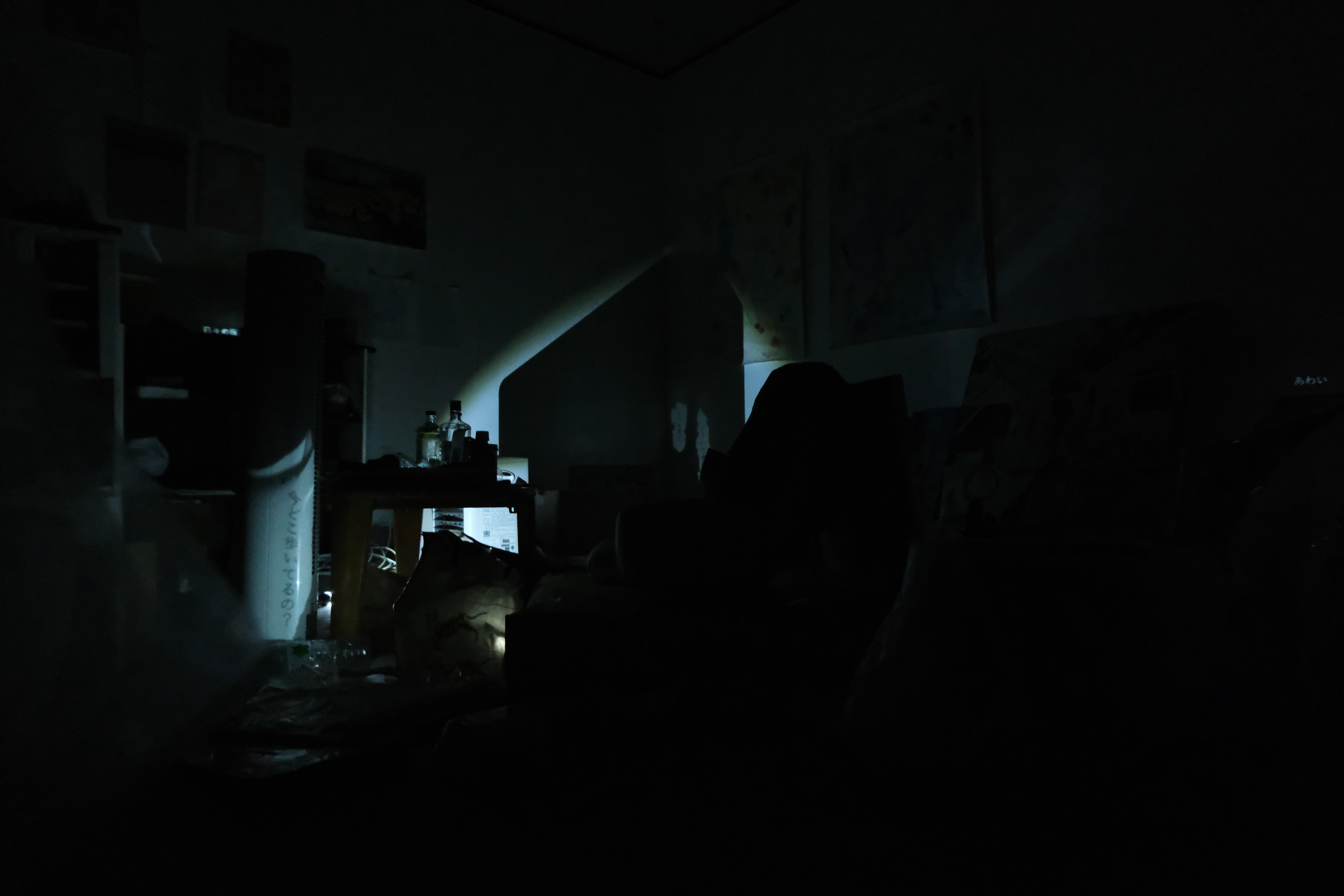 This is the first time I've seen a work in which the text is illuminated by light. Therefore, you may feel as if the letters are suspended in the air as they are. The light, the text, the environmental sound, and the created environmental sound all attempt to create a heterogeneous spatiality by keeping the closed room closed, but allowing others to enter and permeate each other.