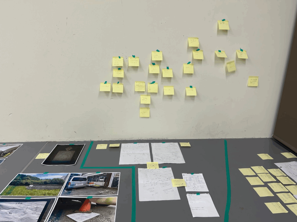 - ここまでの話をもとに、付箋のメモの貼る位置を変えながら、自分たちの問題意識を制度や空間に拡張して考えられそうな場所、地域、その性質を考え、フィールドリサーチするエリアを決める(30分)