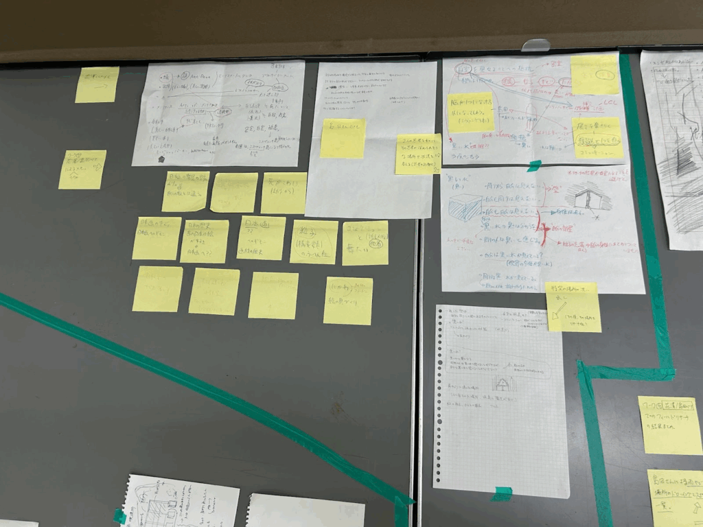 - まずは各人が自分1人で自分の興味関心、思考、置かれた環境境遇に対して思うこと、制作やそれ以外での興味関心、社会に対する躓き(疑問)などを箇条書きでメモする。(15分)