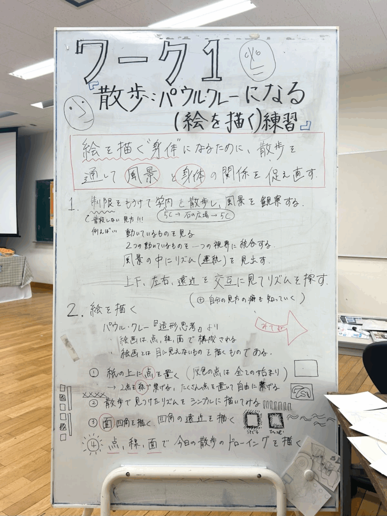 ②パウル・クレーの『造形思考』を手がかりに、宮崎のレクチャーに合わせて「作品」になる手前で点・線・面・グラデーションを扱い、風景を散歩するように絵を描く練習をする。